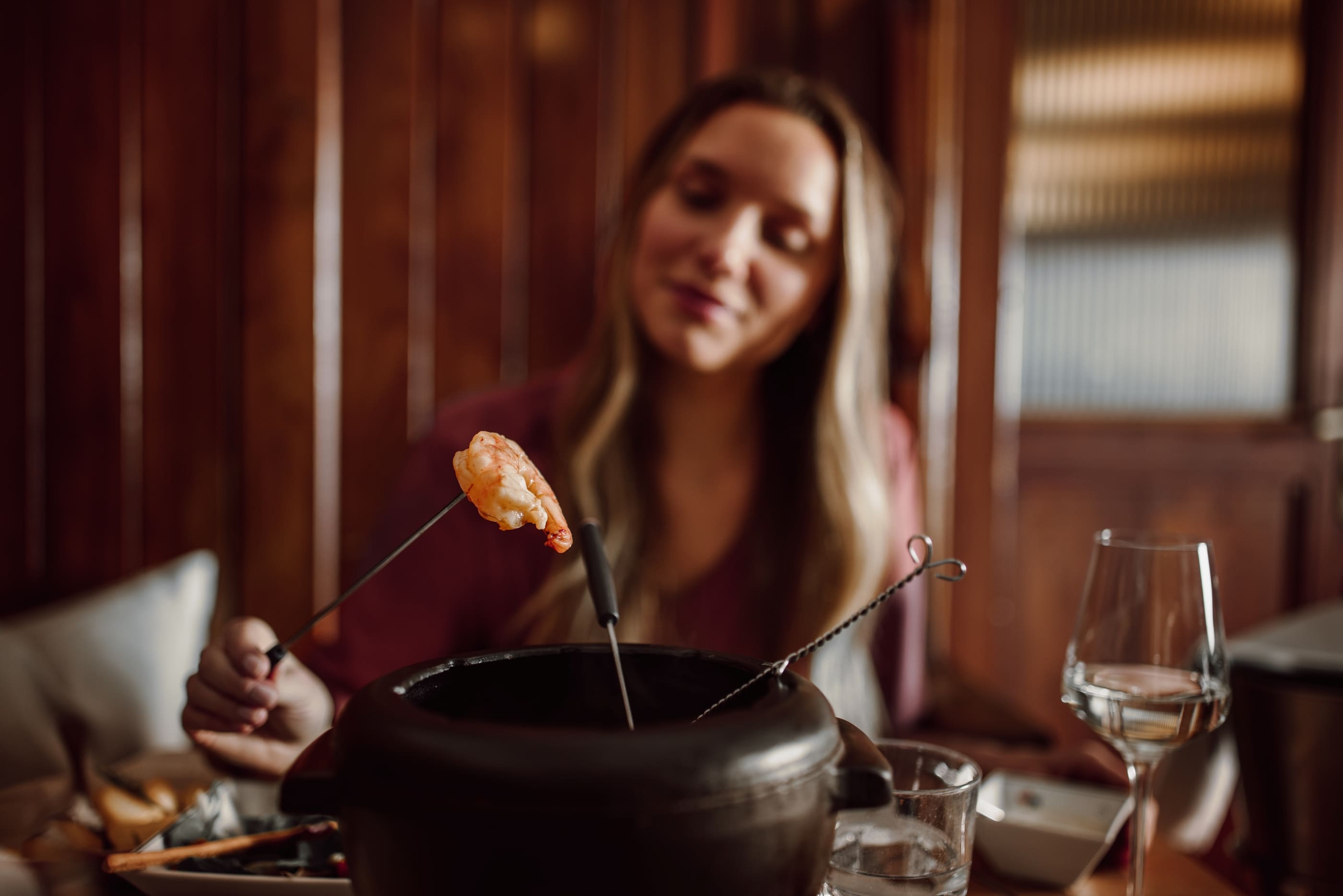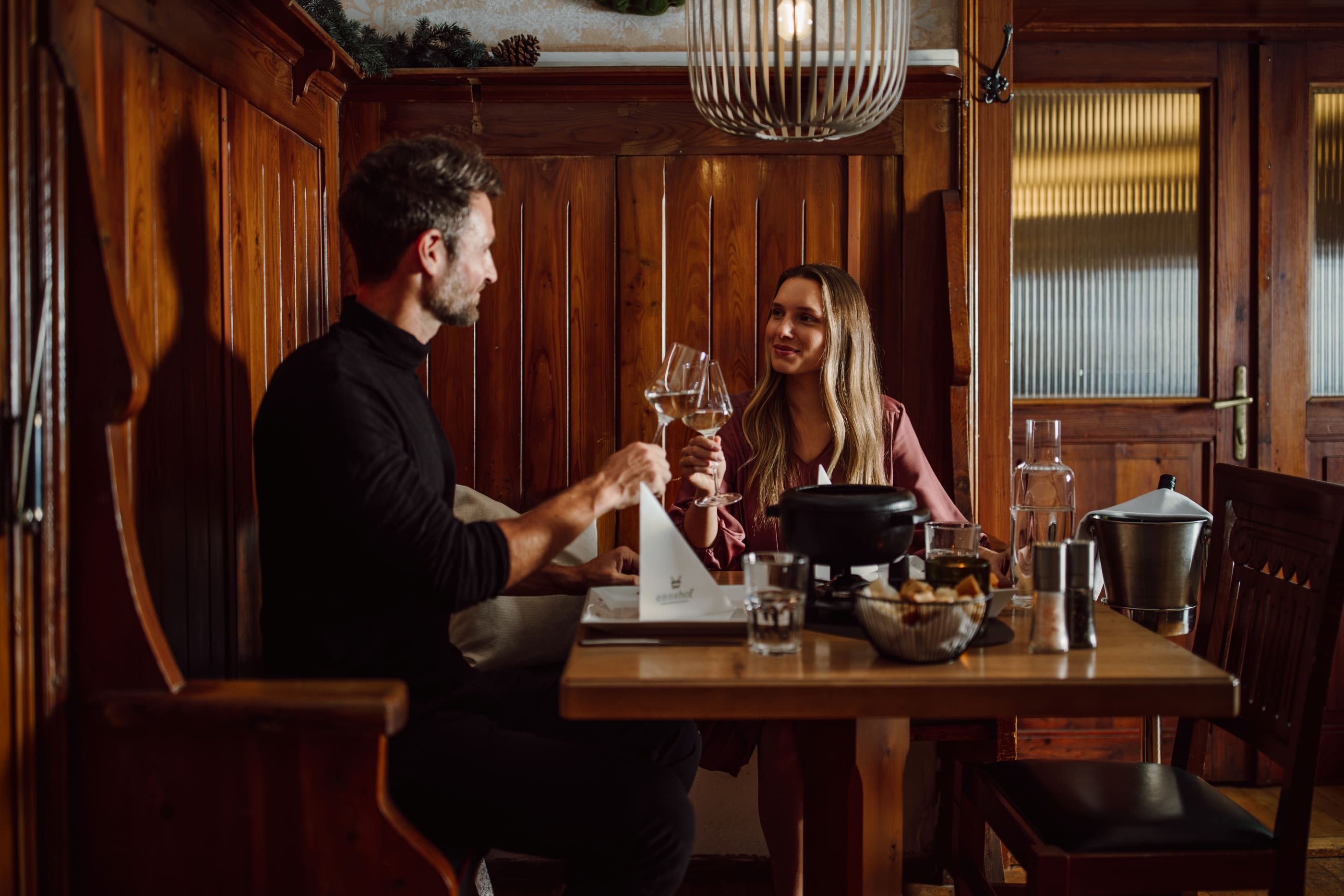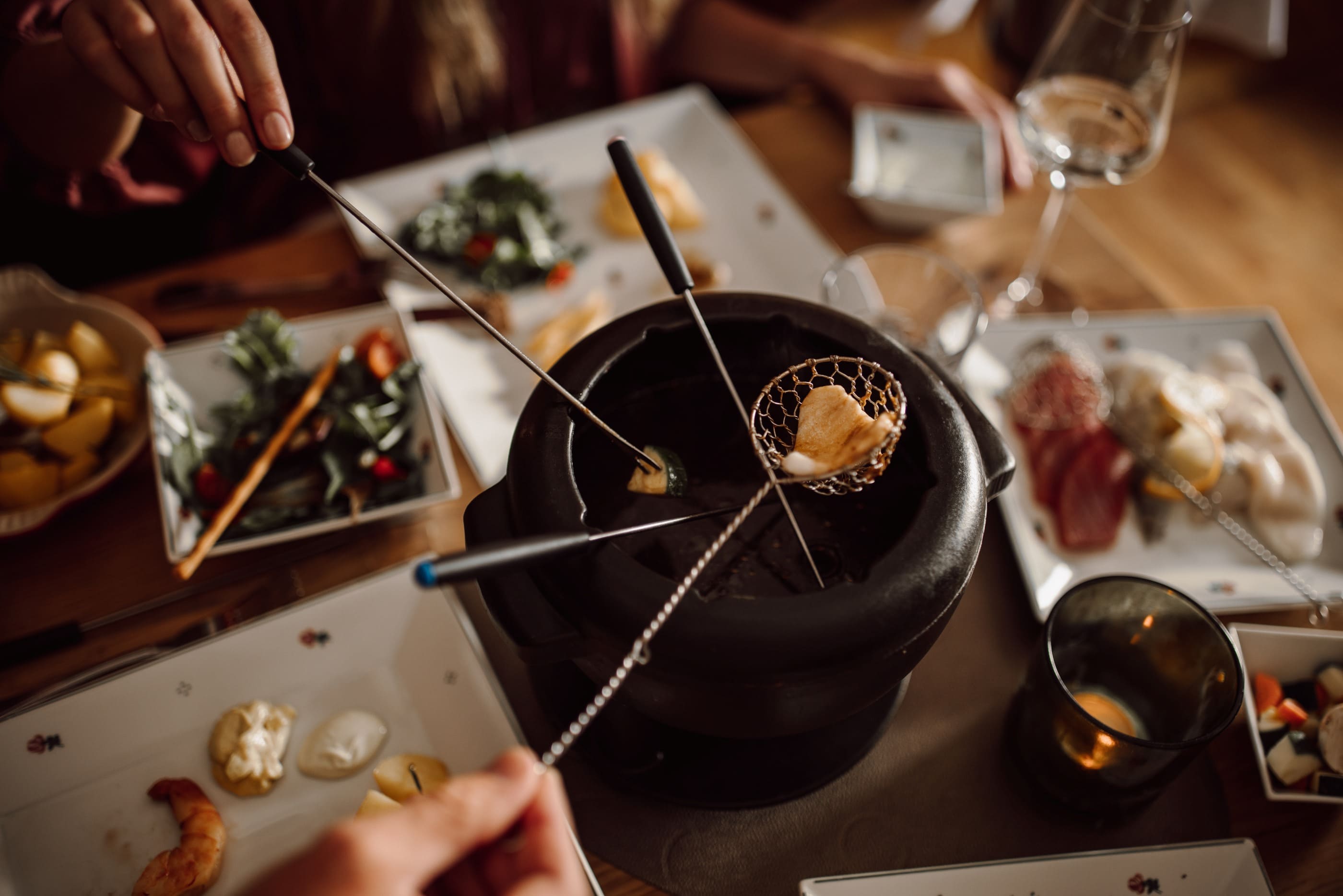 Kann es für ein gemütliches Fondue im Winter einen schöneren Rahmen geben als ein uriges Haus aus dem Jahr 1637? Wenn ihr beim Skifahren oder Après-Ski noch keine roten Wangen bekommen habt, hier glühen sie definitiv! Bei Fondue aller Art: Fleisch-, Fisch- und Veggiefondue in den Varianten Bourguignonne (Öl), Chinoise (Bouillon) und Misosuppe – sowie natürlich Käsefondue und Schokofondue. Das Restaurant ist für alle buchbar, für Hotelgäste und Besucher!