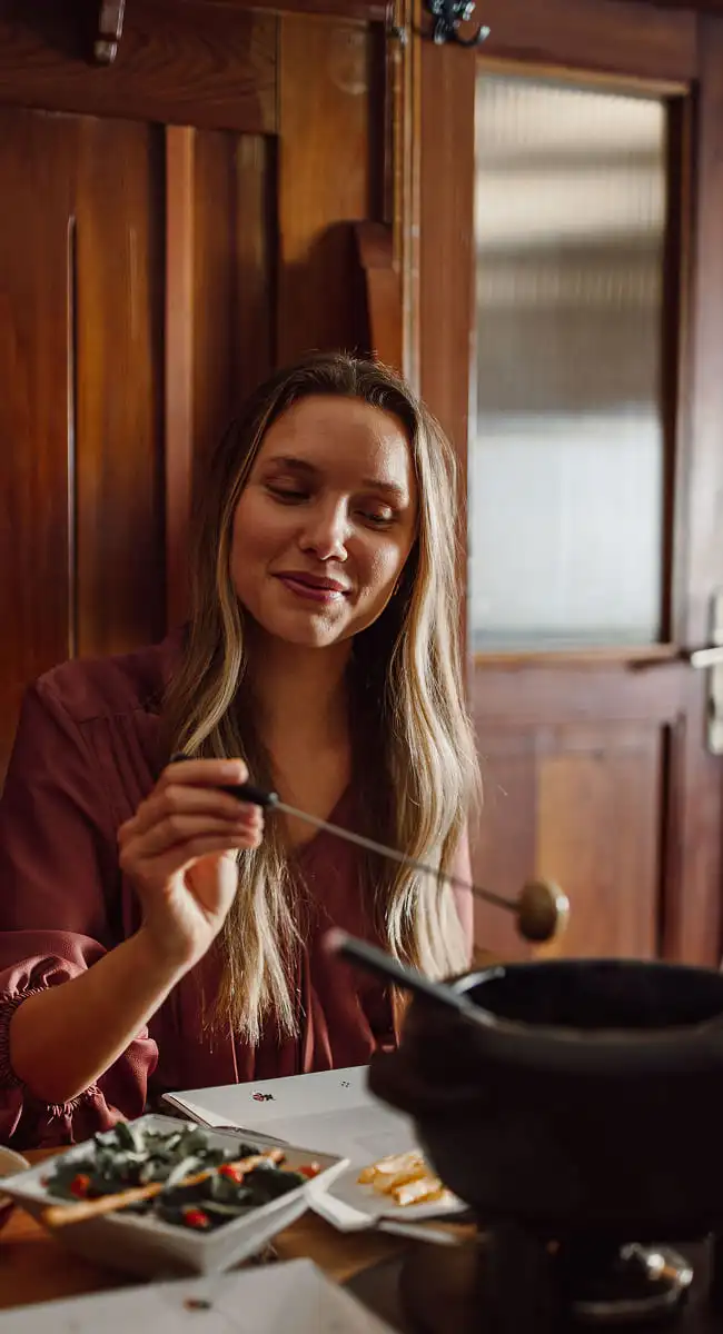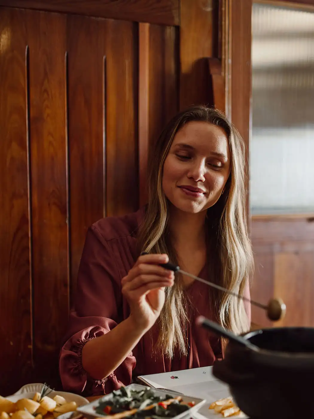 Kann es für ein gemütliches Fondue im Winter einen schöneren Rahmen geben als ein uriges Haus aus dem Jahr 1637? Wenn ihr beim Skifahren oder Après-Ski noch keine roten Wangen bekommen habt, hier glühen sie definitiv! Bei Fondue aller Art: Fleisch-, Fisch- und Veggiefondue in den Varianten Bourguignonne (Öl), Chinoise (Bouillon) und Misosuppe – sowie natürlich Käsefondue und Schokofondue. Das Restaurant ist für alle buchbar, für Hotelgäste und Besucher!